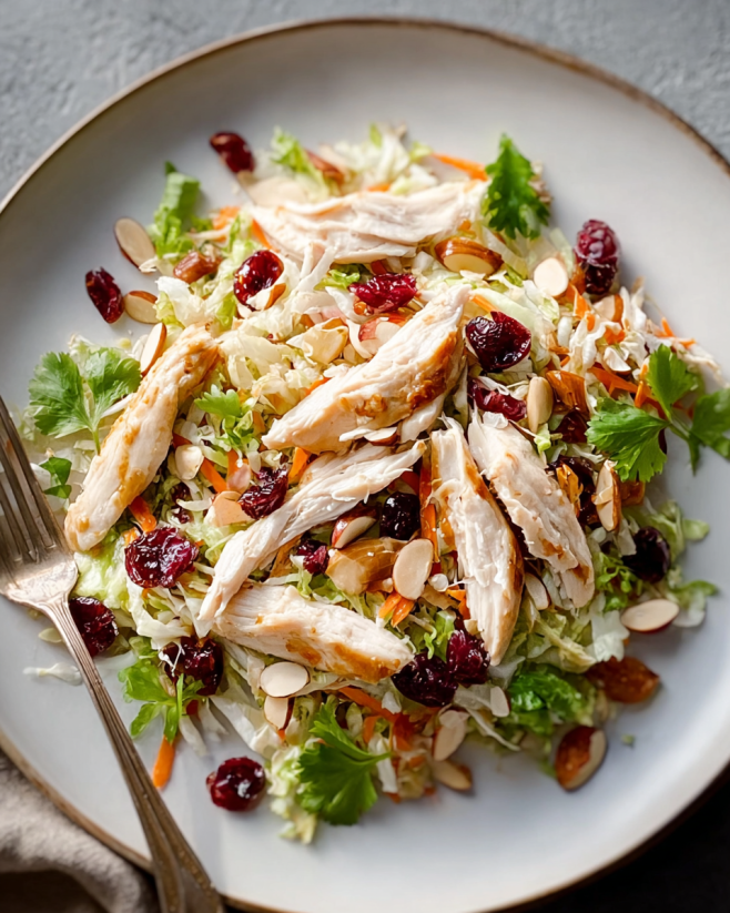 A fresh and vibrant salad combining tender shredded chicken, crunchy vegetables, and sweet dried cranberries, all tossed in a delicious sesame dressing.