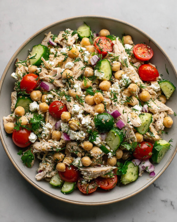 A quick, healthy, and tasty salad packed with flavor and nutrients, combining tender chicken, hearty chickpeas, and fresh vegetables.