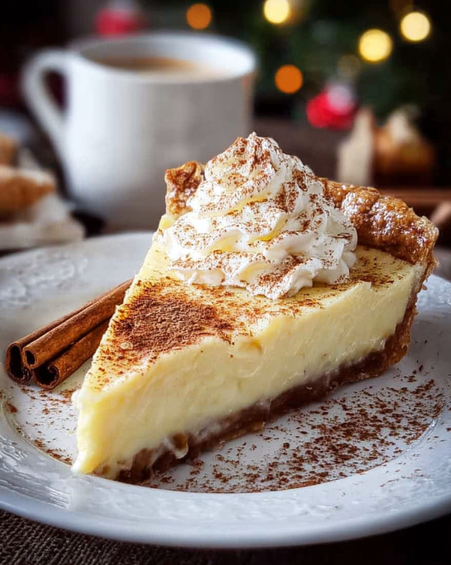 A delightful dessert featuring a creamy custard filling infused with vanilla and cinnamon, all nestled in a flaky pie crust.