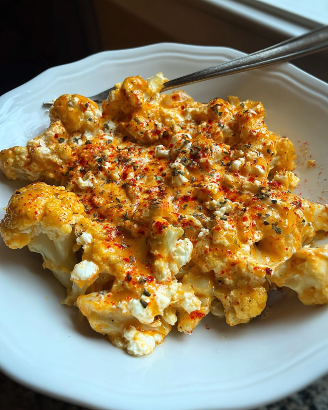 Creamy Buffalo Chicken Cauliflower Casserole is delicious!